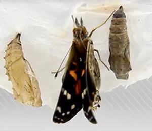 Es ist faszinierend zu sehen, wie sich die Puppen in wunderschöne Schmetterlinge verwandeln. Am Aussehen der Puppe können Sie erkennen, wann die Schmetterlinge schlüpfen: Die Puppe färbt sich ca. 24 Stunden vor dem Schlupf dunkel. Kurz bevor der Schmetterling schlüpft, wird die Puppe durchsichtig und man kann sogar schon die Farben und das Muster der Flügel erkennen.