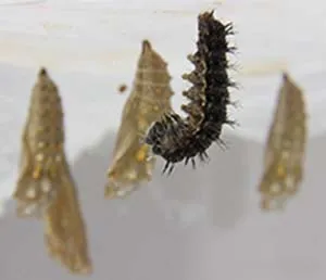 Wenn sich eine Raupe langsamer als andere entwickelt und sich später verpuppt, sollten Sie das Vlies mit den ausgehärteten Puppen (2-3 Tage) schon in die Voliere umsiedeln. Damit sich die Nachzügler-Raupe auch noch verpuppen kann, klemmen Sie einfach Küchenpapier zwischen Deckel und Raupenbecher. Sollte sich eine Raupe gar nicht verpuppen, lassen Sie sie frei und setzen Sie sie auf ein Blatt. Hier eignen sich Distel- oder Brennnesselblätter am besten.